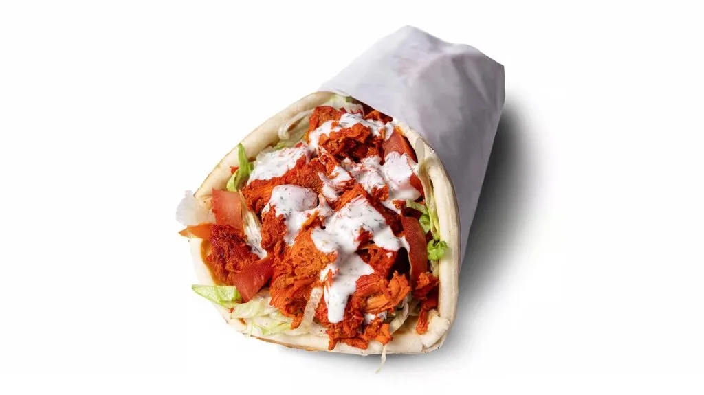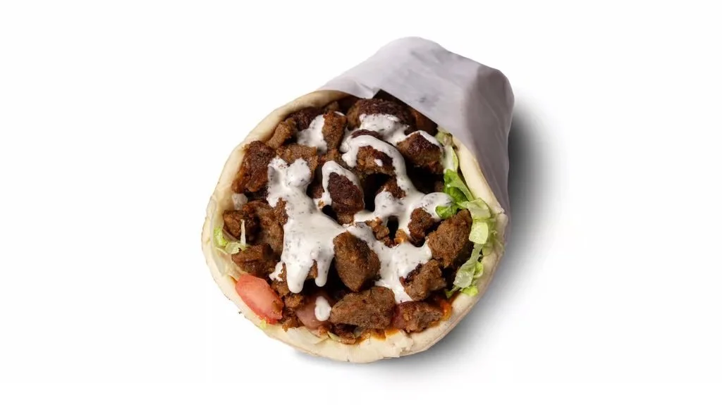Savory marinated chopped chicken, with lettuce and tomatoes topped with our special white sauce wrapped in a warm pita bread.
