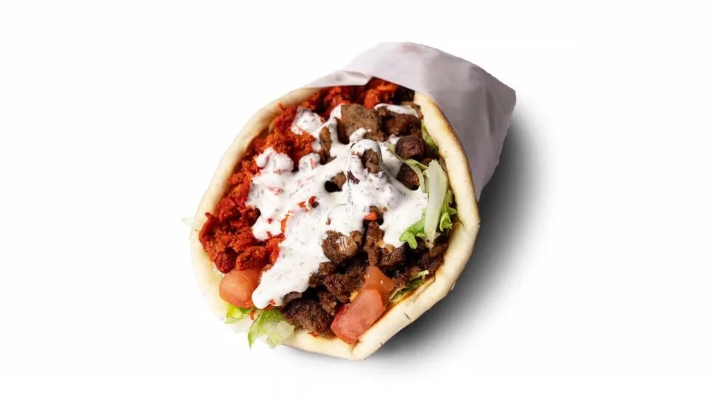 Chopped marinated chicken & seasoned grilled lamb w/ grilled onions, lettuce, and tomatoes topped with our special white sauce wrapped in a warm pita bread. Includes 1/2 extra scoop of meat.