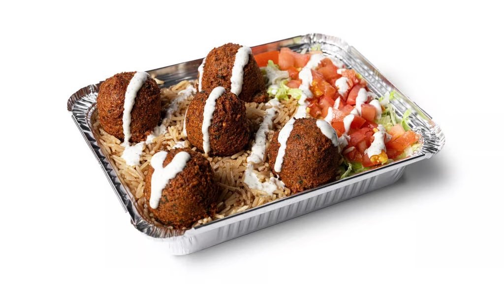 Five deep-fried falafel balls served over our signature basmati rice & house salad topped with our special white sauce.