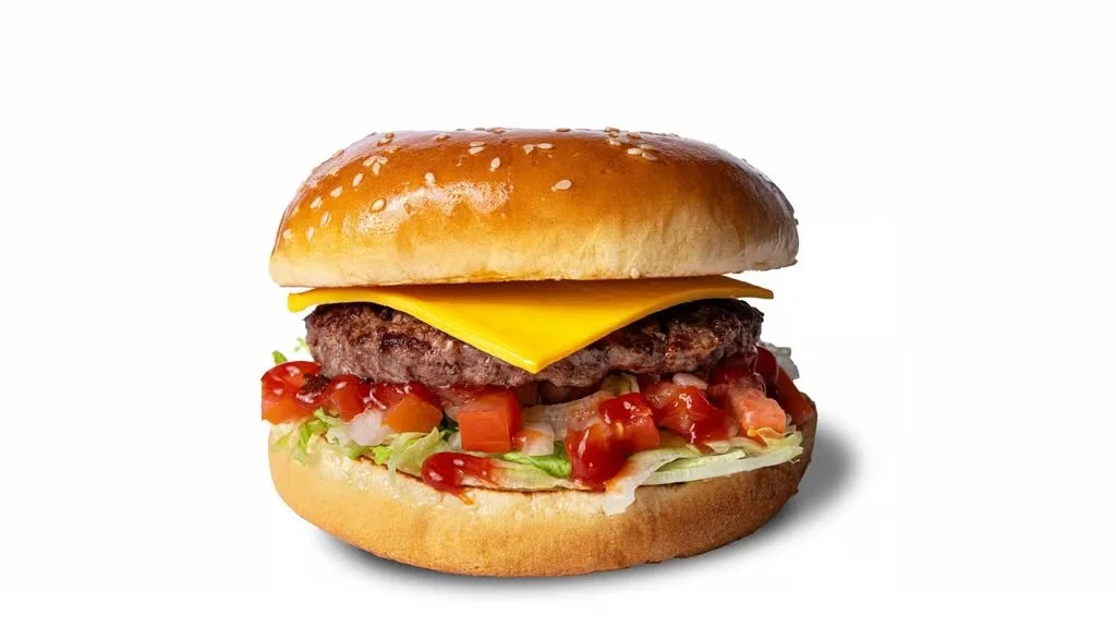 Grilled halal beef patty seasoned with one slice of melted American cheese, lettuce, tomato, sliced onions, ketchup, and mayonnaise on a seeded bun with french fries.